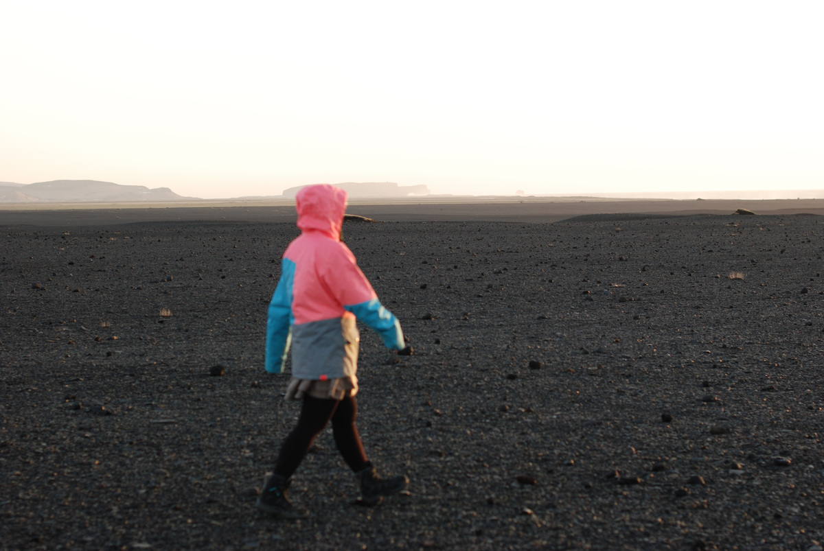 Weg auf einem Vulkangesteinfeld zu einem Flugzeugwrack auf dem schwarzen Strand.