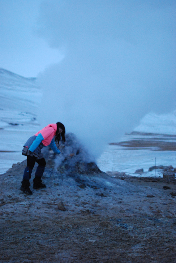 Wenwen inspiziert eine vulkanische Austrittsstelle von heißem Wasserdampf gemischt mit nach faulen Eiern duftendem Schwefel-Wasserstoff.